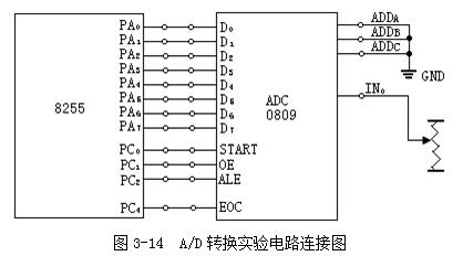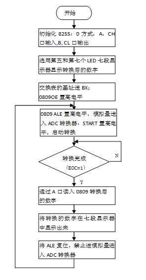 编写程序,利用ADC0809A/D转换器,将从电位器读取的直流电压转换成二进制数字,将该二进制数字在LED七段显示器中显示出来,验证输入电压和转换后数字的正确性。实验台中的电位器可以输出0~5V的直流电压。ADC0809所需的控制信号由8255A的PC口提供。