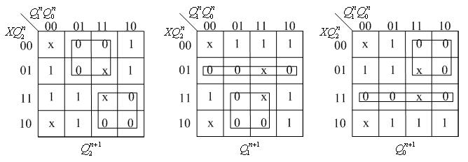 根据表1得到Q2n+1、Q1n+1、Q0n+1的状态卡诺图,如图2所示,并由卡诺图得出状态方程,如式(1)所示。