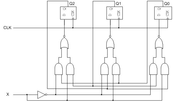 用D触发器设计一个可控计数器。当X=0时,计数顺序为4→5→1→3→2→6→4;X=1时,计数顺序为4→6→2→3→1→5→4。组合电路采用与门、或非门及非门实现。